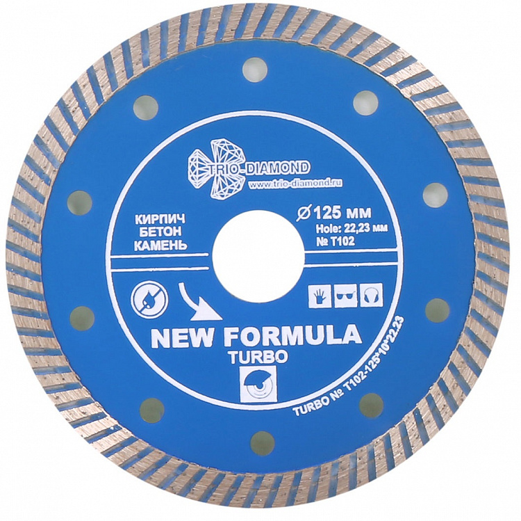 Алмазный диск Trio Diamond New Formula Turbo 125 мм - изготовлен методом холодного прессования. Диск используется для резки армированного бетона, бетона, кирпича, огнеупоров, камня, песчаника и бордюрного камня. Толщина алмазного слоя 2,2 мм, а высота 10 мм. Посадочное отверстие - 22,23 мм. Глубина реза составляет 20 мм. Рифленая кромка обеспечивает чистый рез без сколов. Отверстия на диске способствуют лучшему охлаждению и продлевают срок службы. Резка осуществляется как с применением водяного охлаждения, так и без. Диск подходит для работы на УШМ.
